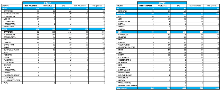 • au total 487 magasins Carrefour concernés, si l’on inclut les impacts « Peu probables ».